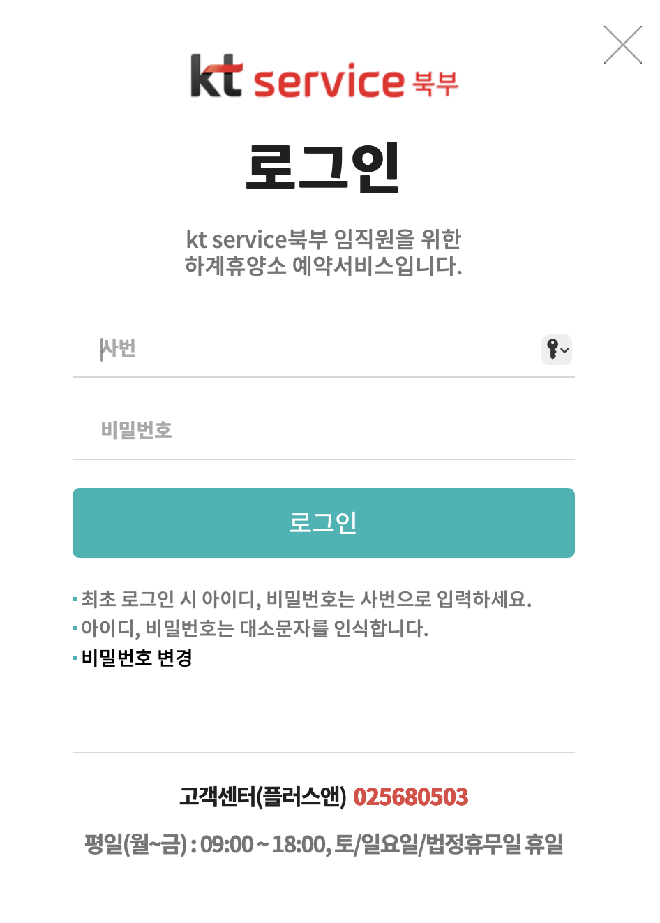 kt service 북부 임직원을 위한 하계휴양소 예약서비스입니다. 최초 로그인 시 아이디와 비밀번호는 사번으로 입력하시기 바랍니다. 대소문자를 인식하기 때문에 caps lock 키 활성화 여부를 체크하시기 바랍니다.