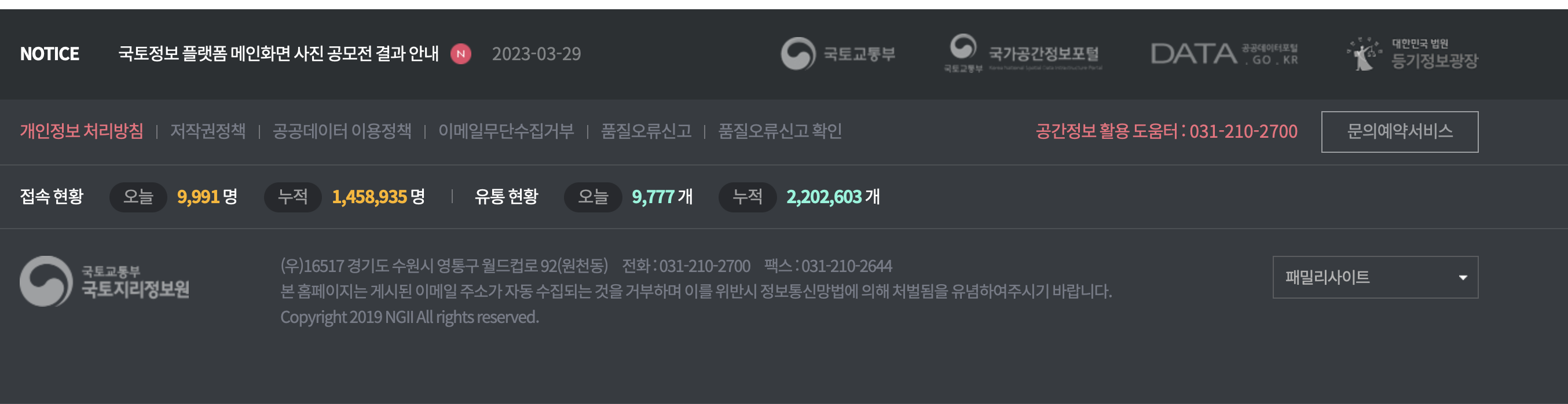 국토교통부 국토지리정보원 (우)16517 경기도 수원시 영통구 월드컵로 92(원천동) 전화 : 031-210-2700 팩스 : 031-210-2644 본 홈페이지는 게시된 이메일 주소가 자동 수집되는 것을 거부하며 이를 위반시