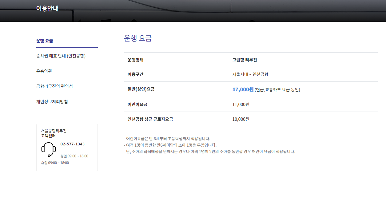 서울시내 - 인천공항 구간 노선에 따른 성인요금은 17,000원 , 어린이요금 11,000원, 인천공항 상근 근로자는 10,000원 입니다.