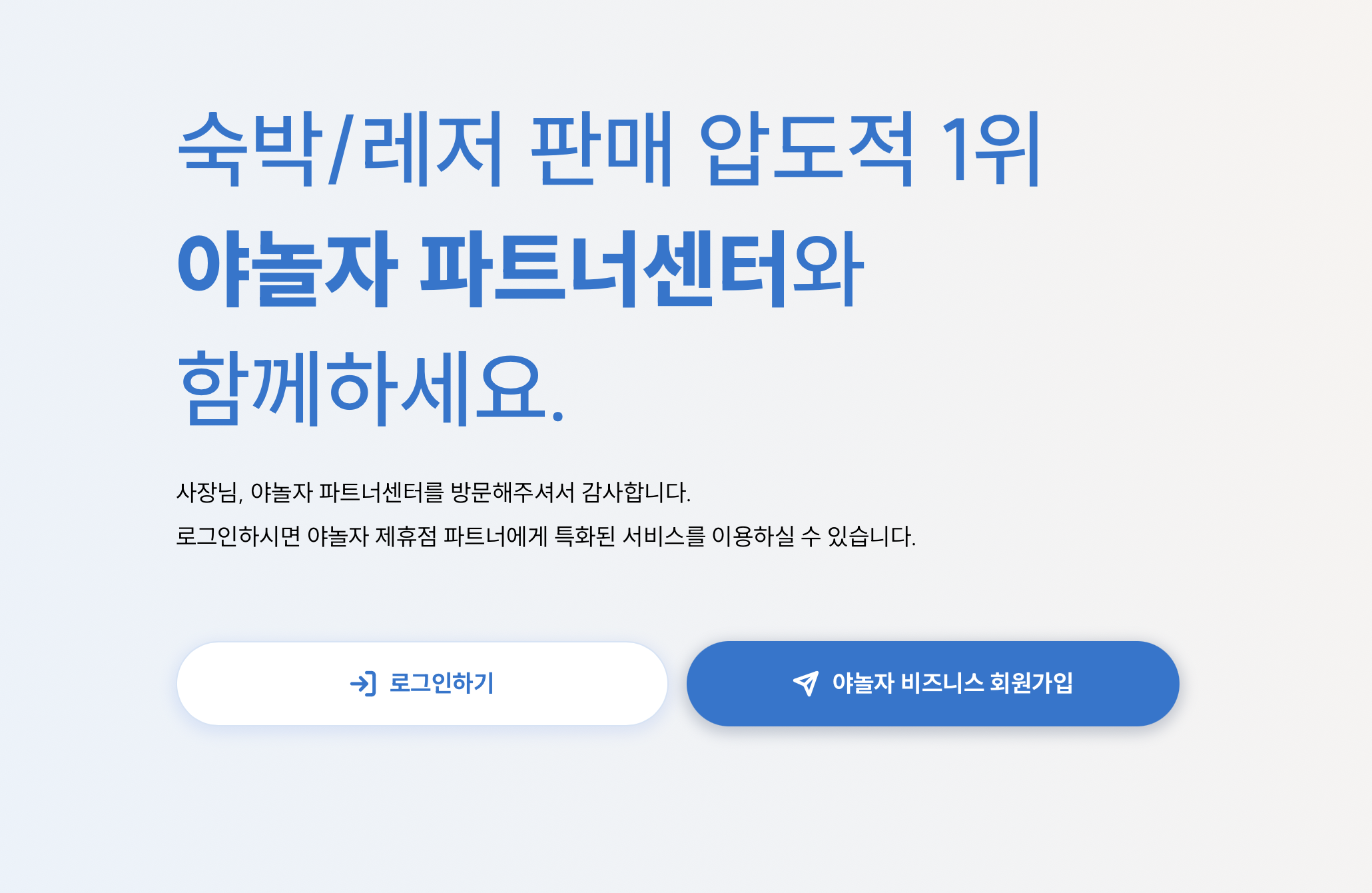 야놀자 파트너센터는 국내숙박 앱 1위 야놀자의 노하우와 기술력을 바탕으로 숙박 업체에 필요한 모든 기능을 제공하는 숙박 운영 통합 솔루션 입니다.
