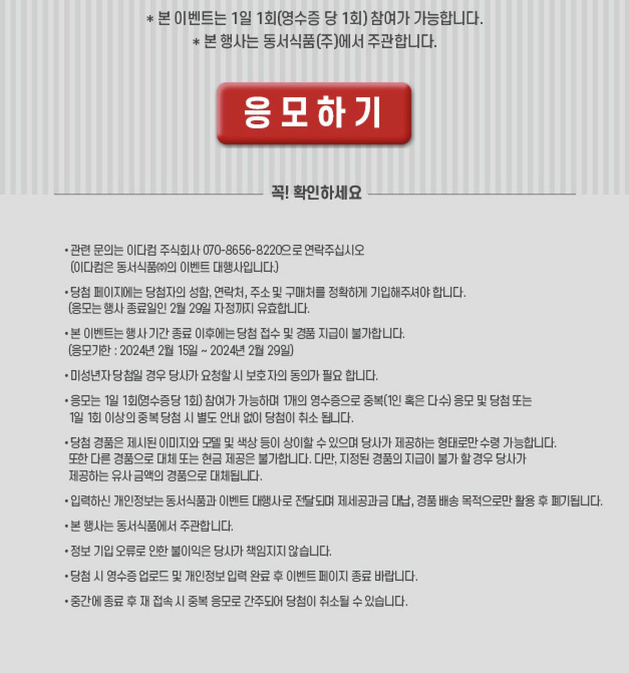 본 행사는 영수증 당 1회만 응모가 가능하며, 1개의 영수증으로 중복 응모 및 당첨 시 별도 안내 없이 당첨이 취소됩니다.