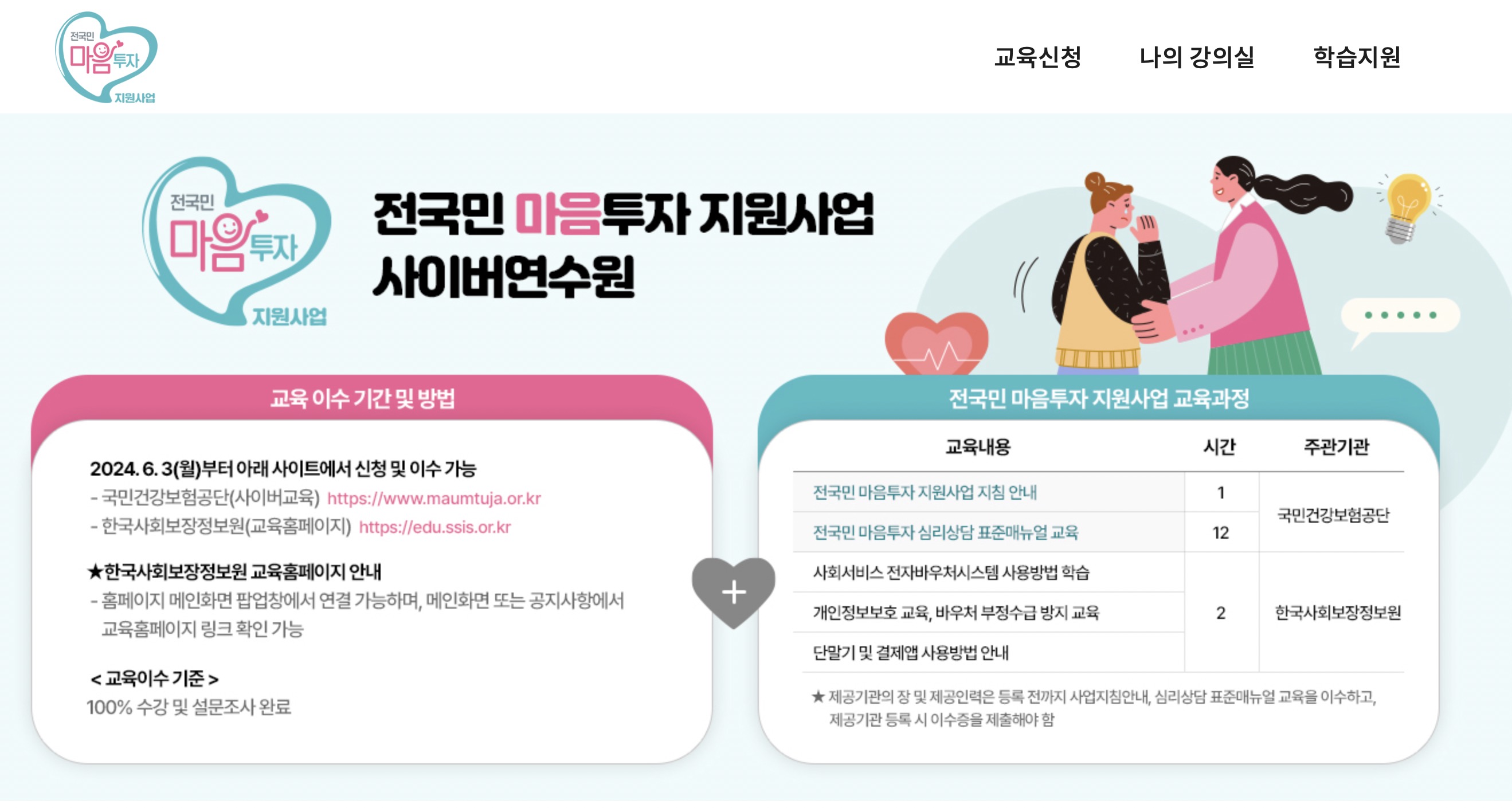 전국민 마음투자 지원사업 건강보험 사이버연수원 홈페이지 안내입니다.